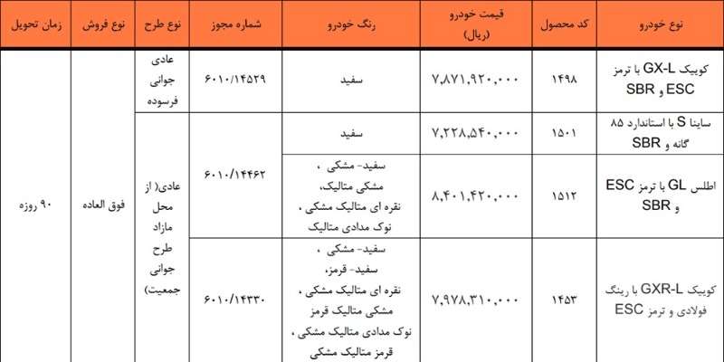 جدیدترین شرایط فروش محصولات گروه خودروسازی سایپا برای سال ۱۴۰۴ اعلام شد. در این مرحله از فروش فوقالعاده، خودروهای کوییک GX-L، ساینا S، اطلس GL و کوییک GXR-L با قیمت قطعی و موعد تحویل ۹۰ روزه عرضه میشوند. ثبتنام از ساعت ۱۰ صبح روز چهارشنبه ۶ اسفند آغاز شده و تا ساعت ۱۸ روز شنبه ۹ اسفند ادامه دارد.