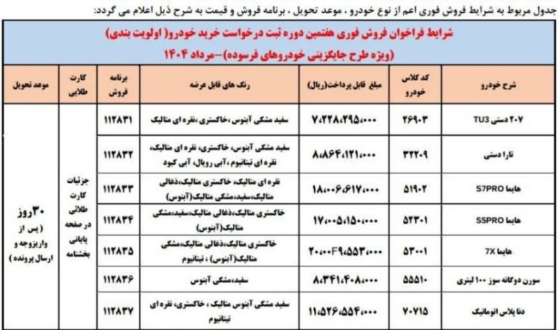 خودرو های عرضه شده در این طرح شامل پژو ۲۰۷ دستی TU۳، تارا دستی، هایما S۷ PRO، هایما S۵ PRO، هایما ۷X، سورن دوگانهسوز و دنا پلاس اتوماتیک با رنگبندی متنوع و قیمت حدودی از ۷۲۲ میلیون تا ۲ میلیارد تومان هستند.