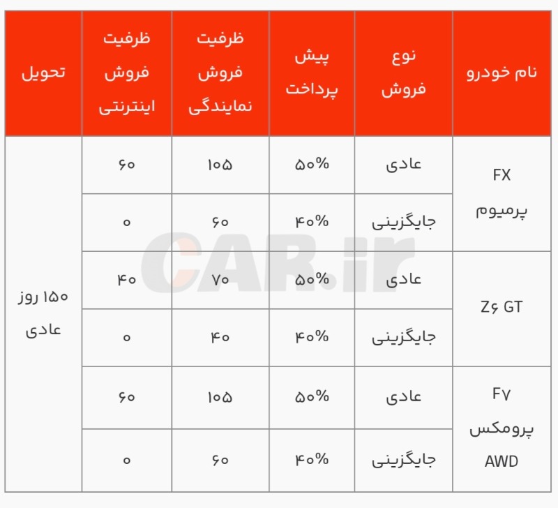 جزئیات پیشفروش شامل 3 خودرو فونیکس FX پرمیوم، Z6 GT (آریزو 6 جیتی) و F7 پرومکس AWD (تیگو 7 پرومکس دو دیفرانسیل) که در دو طرح جایگزینی و عادی بوده و متقاضیان میتوانند با پیشپرداخت ۴۰ یا ۵۰ درصد، نسبت به ثبتنام اقدام کنند؛ تحویل خودروها ۱۵۰ روزه خواهد بود و ظرفیت محدود با قیمت غیرقطعی است. ثبتنام نیز شنبه، از ساعت ۱۰ تا ۱۱ صبح انجام میشود.