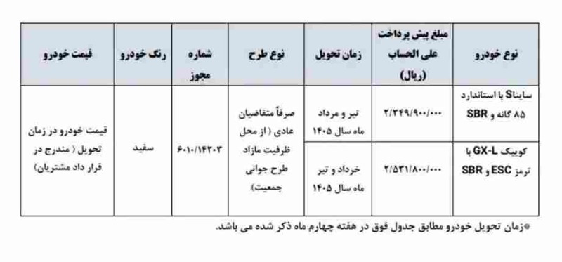 متقاضیان از ساعت ۱۰ روز سه شنبه مورخ ۱۴۰۴.۰۷.۲۹ تا تکمیل ظرفیت می‌توانند با ورود به سایت فروش اینترنتی محصولات گروه خودروسازی سایپا ، نسبت به ثبت نام و انتخاب نوع خودرو اقدام نمایند.