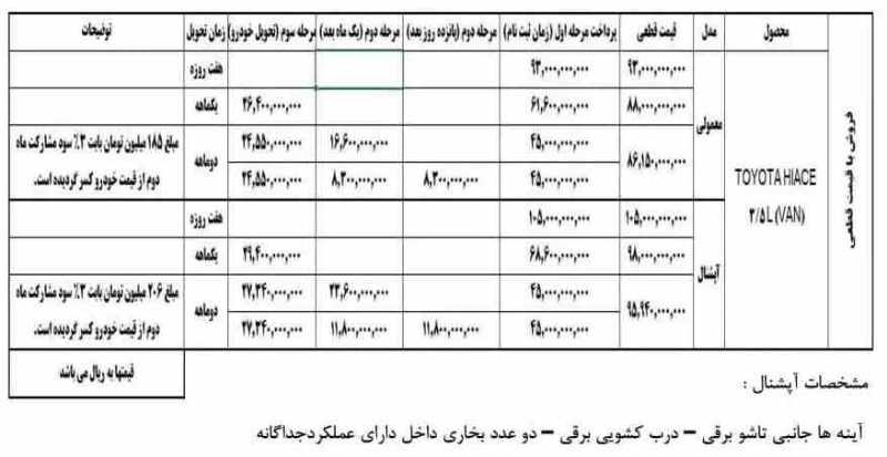 فروش تویوتا هایس (ون) از امروز یکشنبه 11 آبان ماه 1404 در چند تیپ در نمایندگی های فروش این شرکت با قیمت قطعی فعال خواهد شد.