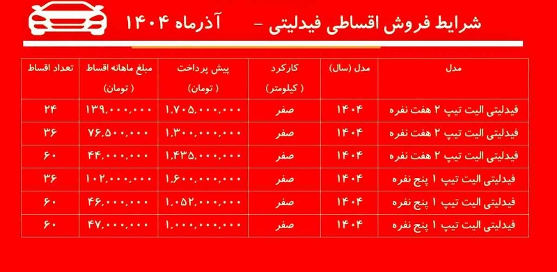 بر اساس جدیدترین آگهیهای فروش اقساطی فیدلیتی در نمایشگاههای شخصی خودرو، فیدلیتی الیت تیپ ۲ هفتنفره با پیشپرداخت یک میلیارد و ۷۰۵ میلیون تومان و پرداخت ماهیانه ۱۳۹ میلیون تومان در قالب ۲۴ قسط در دسترس خریداران قرار گرفته است.