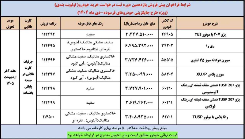 طرح فراخوان پیش‌فروش محصولات قابل عرضه شرکت ایران‌خودرو در یازدهمین دوره ثبت درخواست خرید خودرو ویژه متقاضیان طرح جایگزینی خودروهای فرسوده غیرتاکسی ۱۴۰۳ ادامه خواهد داشت. بدیهی است مطابق جدول فوق از روز چهارشنبه مورخ ۱۴۰۴/۱۰/۱۰ شروع و تا پایان روز چهارشنبه مورخ ۱۴۰۴/۱۰/۱۷ ادامه خواهد داشت. بدیهی است مشتریان پس از عقد قرارداد و واریز پیش‌پرداخت (پرداخت مرحله اول) در سایت esale.ikco.ir امکان دریافت پیامک انتخاب و مراجعه به مرکز اسقاط را خواهند داشت.