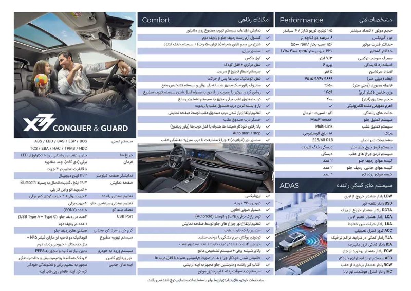 همچنین سیستم‌های ABS، EBD، BAS، ESP، BOS، TCS، EBA، HAC، HDC و TPMS در کنار ۶ کیسه هوا (جلو، جانبی و پرده‌ای) سطح ایمنی سرنشینان را ارتقا می‌دهند. ترمزهای دیسکی در هر چهار چرخ و رینگ‌های آلومینیومی ۱۸ اینچی نیز بخشی از مشخصات ایمنی و فنی این کراس‌اوور محسوب می‌شوند. X77 از سه حالت رانندگی اکو، نرمال و اسپرت پشتیبانی می‌کند که متناسب با شرایط مسیر قابل انتخاب است.